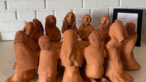 Skærtorsdag ved Kirsten Weile. Billedet er fra Marianne Bønløkkes påskeudstilling "Mødet", som kan ses i kirkerummet.